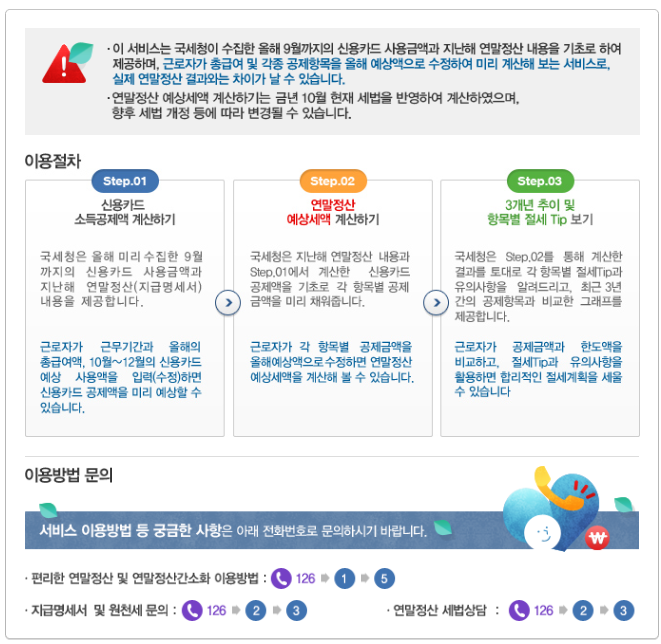 국세청이 수집한 올해 9월까지의 신용카드 사용금액과 지난해 연말정산 내용을 기초로 하여 제공하게 되며, 총급여 및 각종 공제항목을 올해 예상액으로 수정하여 미리 조금 더 정확하게 계산해 볼 수 있습니다.