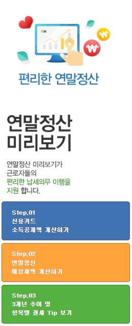 신용카드 소득공제액 계산읗라고 연말정산 예쌍세액 계산, 3개년 추이 및 항목별 절세 Tip 까지 확인할 수 있습니다.